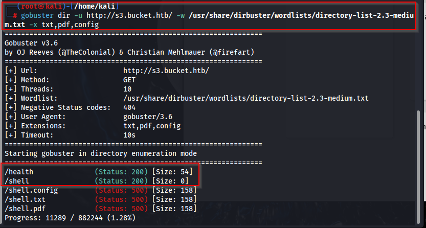 I was unable to click on any of the objects on the home page to go anywhere else. Fuzzing for other directories did not pan out on the base page either. So I started to fuzz for directories on the http://s3.bucket.htb page and ended up finding some 200 OK returning pages.