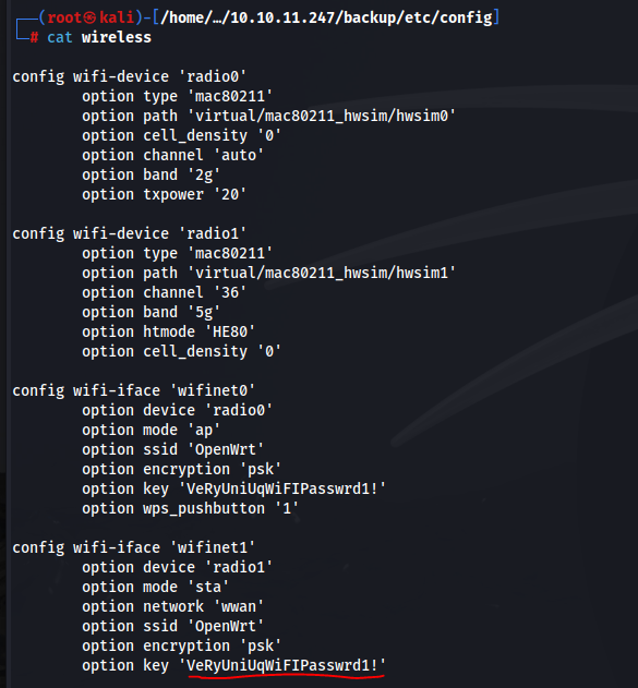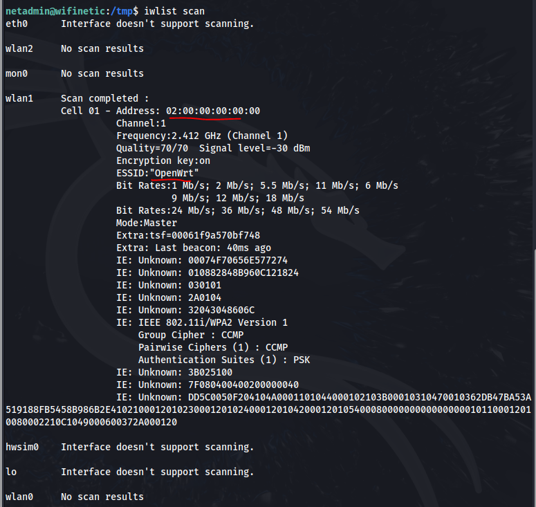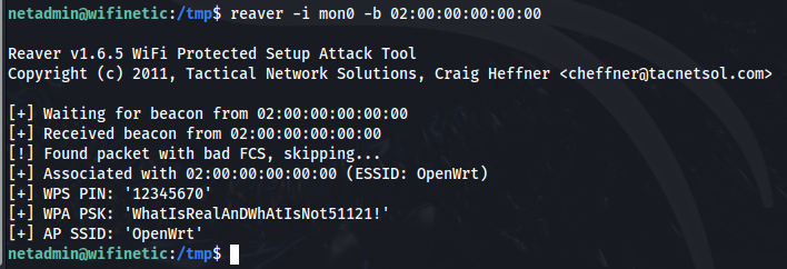 Now we have the BSSID and ESSID, we can run the tool reaver against this open '“OpenWRT” network that was mentioned lightly in the files we found on the FTP share. We will also use the mon0 interface we found.