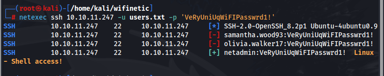 We have some users, a password, and we know SSH is running on the target machine. We can use NETEXEC to password spray the target machine using what we have and hope we can get an opening to this machine.