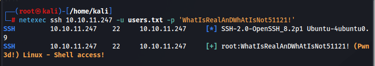 Repeating the password spraying attack through crackmapexec (netexec) we are able to immediately see that the root user matches this password.