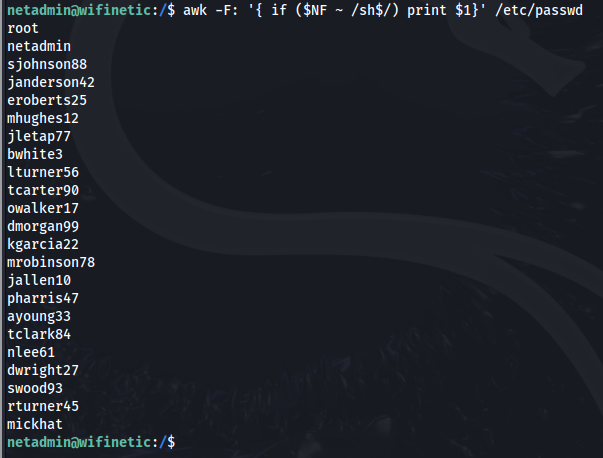 This is a good way to get a top level view of all of the user accounts, as all of these shells tend to end with sh.