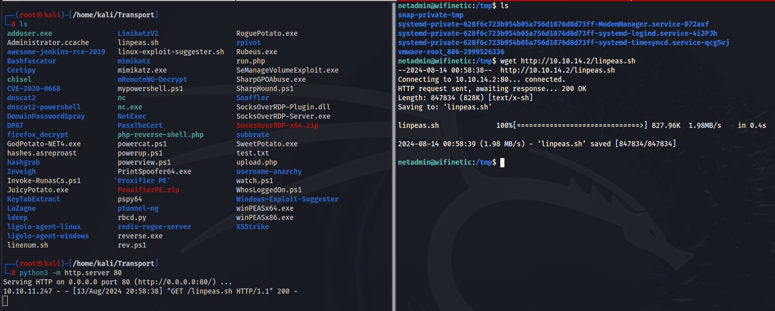 Start a Python3 HTTP Server and transport Linpeas to the target. Then make it executable with chmod +x linpeas.sh and run with ./linpeas.sh